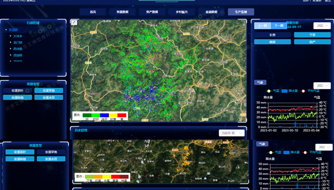利用卫星遥感对水稻、大豆、玉米、小麦、棉花、果树等大田作业进行光学分析,针对不同生育周期的长势、病虫害、干旱、洪涝、冷害、倒伏以及估产进行分析监测,辅助大田生产宏观层面的监测,分析走势,采取有效的管理和预防措施……